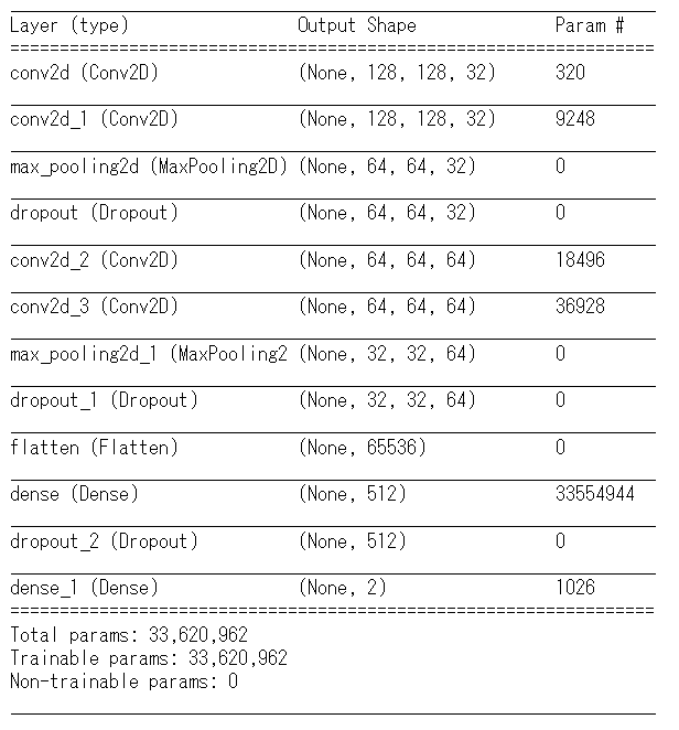 「畳み込み層」×「畳み込み層」×「プーリング層」×「ドロップアウト」×「畳み込み層」×「畳み込み層」となっています。