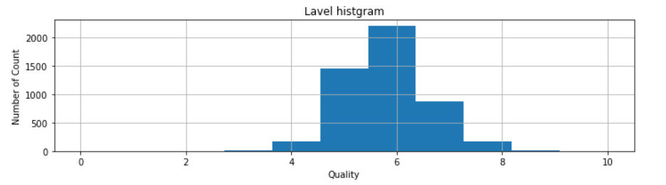 import matplotlib.pyplot as plt plt.figure(figsize = (10,3)) plt.hist(wine["quality"] , bins=11, range = (0,10)) plt.title("y_train histgram") plt.xlabel("Quality") plt.ylabel("Number of Count") plt.grid(True) plt.tight_layout()