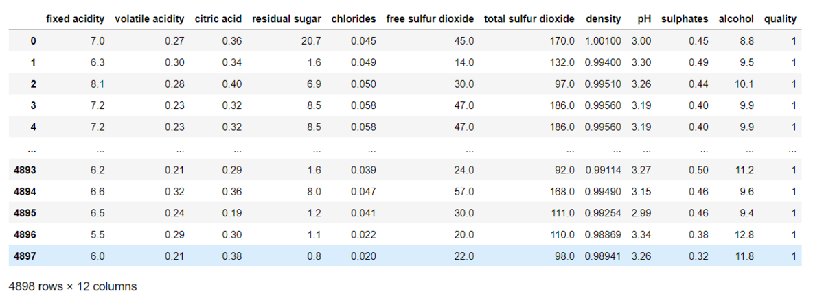 import pandas as pd wine = pd.read_csv('winequality-white.csv', encoding="utf-8", sep = ";") wine