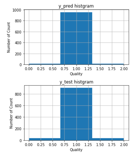 plt.figure(figsize = (5,6)) plt.subplot(2,1,1) plt.hist(y_pred, bins=3, range = (0,2)) plt.title("y_pred histgram") plt.xlabel("Quality") plt.ylabel("Number of Count") plt.grid(True) plt.subplot(2,1,2) plt.hist(y_test, bins=3, range = (0,2)) plt.title('y_test histgram') plt.xlabel('Quality') plt.ylabel('Number of Count') plt.grid(True) plt.tight_layout()