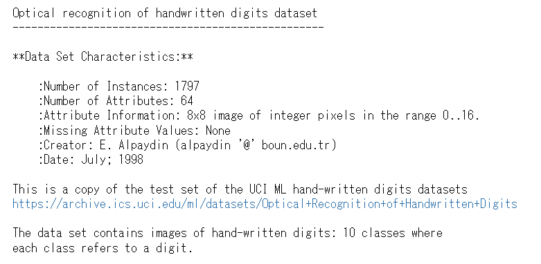 from sklearn import datasets text = datasets.load_digits() print(text.DESCR)