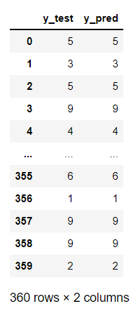import numpy as np import pandas as pd y_test = np.array(y_test) y_pred = np.array(y_pred) matrix = np.array([y_test,y_pred]).T df = pd.DataFrame(matrix, columns = ["y_test","y_pred"] ) df