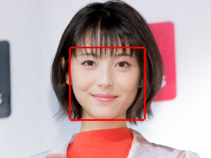 face_detectionという関数を作り、画像情報と出力したロケーション情報から、元画像に対して赤四角ラインを追加するものをつくり、実行しています。